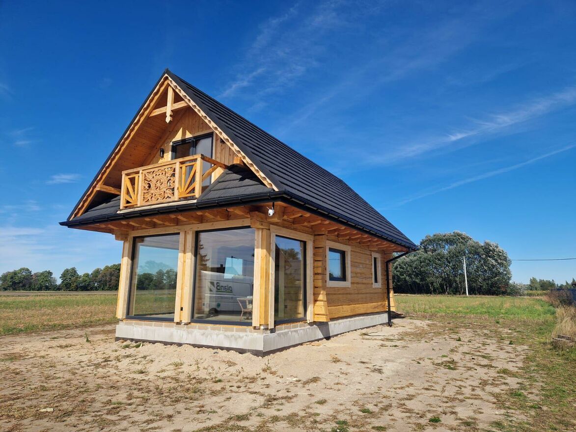 Dom z płazów jednolitych, na obce pióro, z mszeniem jak na załączonych wizualizacjach.